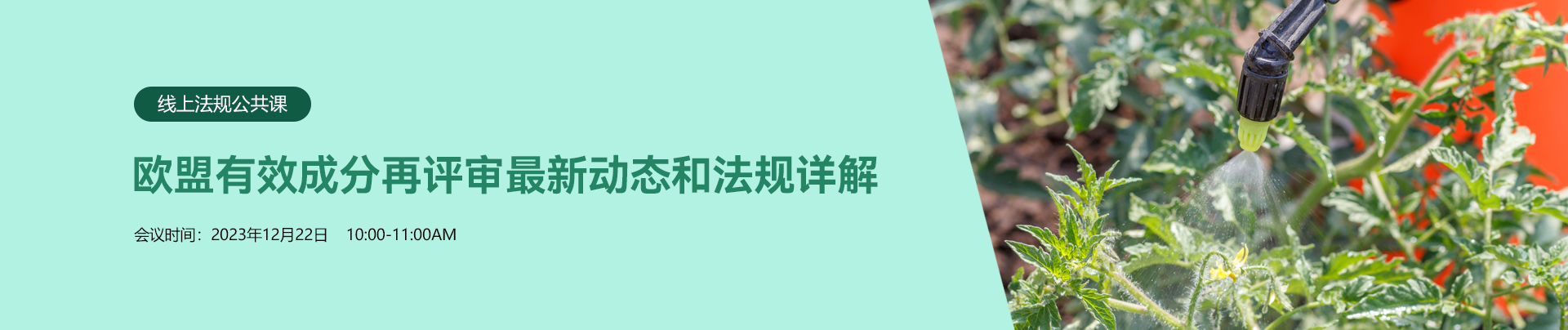 中文 | 2023年12月22日 | 10:00 -11:00AM | 歐盟有效成分再評審最新動態和法規詳解 丁平 女士 瑞旭集團農化事業部總經理 |