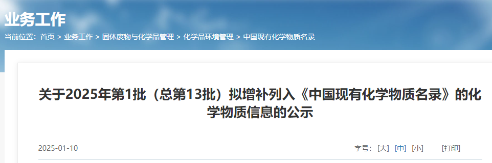 根據《指南》有關要求,為體現公開、公平、公正的原則,接受公眾監督,現將2025年第1批(總第13批)擬增補列入《中國現有化學物質名錄》的7種化學物質信息(見附表)在我部政府網站上公示。