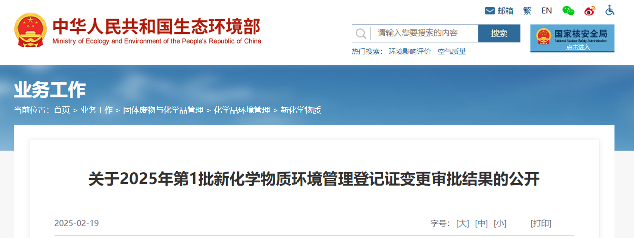 生態環境部發布關于2025年第1批新化學物質環境管理登記證變更審批結果的公開