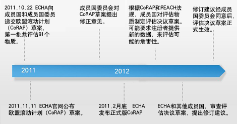 2011年11月11日,ECHA正式發布首批歐盟滾動計劃(CoRAP)的草案,并發布了CORAP的實施時間圖: