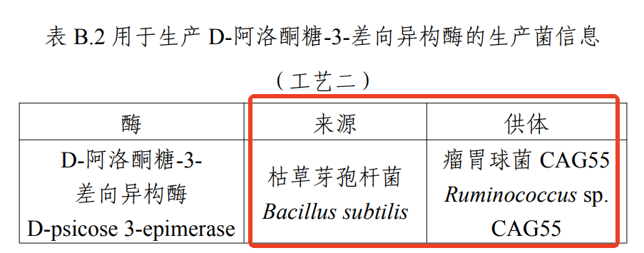 工藝二(酶轉化法):以果糖為原料,經允許使用的D-阿洛酮糖-3-差向異構酶催化轉化,再經脫色、分離、提純、結晶等工藝制成。公告中附錄B的表B.2說明了D-阿洛酮糖-3-差向異構酶的生產菌信息。