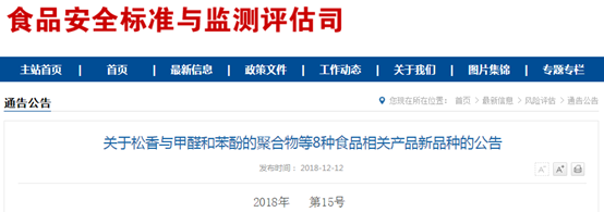 國家衛生健康委食品安全標準與監測評估司于2018年12月12日發布關于松香與甲醛和苯酚的聚合物等8種食品相關產品新品種的公告,其中包括5種食品接觸材料及制品用添加劑新品種,2種食品接觸材料及制品用樹脂新品種,1種擴大使用范圍的食品接觸材料及制品用樹脂,相關信息如下: