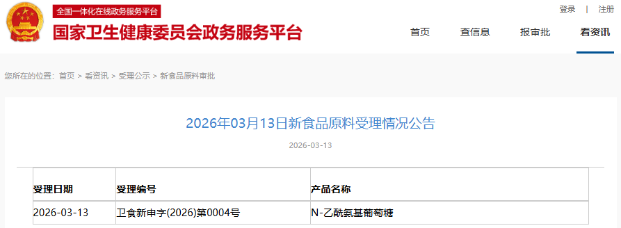 1 | 2026-03-13 | 衛食新申字(2026)第0004號 | N-乙酰氨基葡萄糖 |