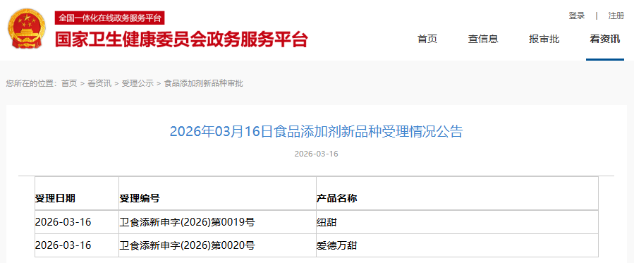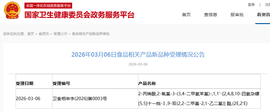 近日,國家衛生健康委員會政務服務平臺發布三新食品受理情況,新增2款新食品原料,2款食品添加劑新品種和3款食品相關產品新品種受理。