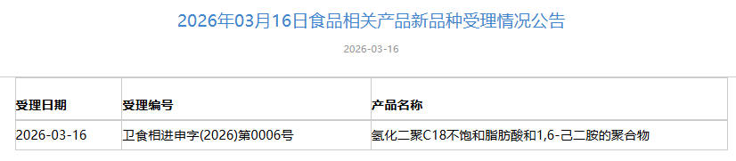 2 | 2026-03-06 | 衛食相進申字(2026)第0006號 | 氫化二聚C18不飽和脂肪酸和1,6-己二胺的聚合物 |
