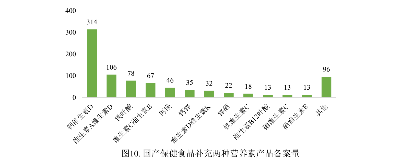 已備案進口保健食品中補充多種維生素礦物質的產品、補充鈣和維生素D的產品和補充維生素D的產品為三大主流產品,備案量分別為9款、9款和7款。