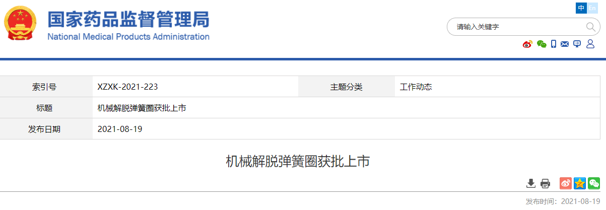 近日,國家藥品監督管理局經審查,批準了上海沃比醫療科技有限公司生產的創新產品“機械解脫彈簧圈”注冊。