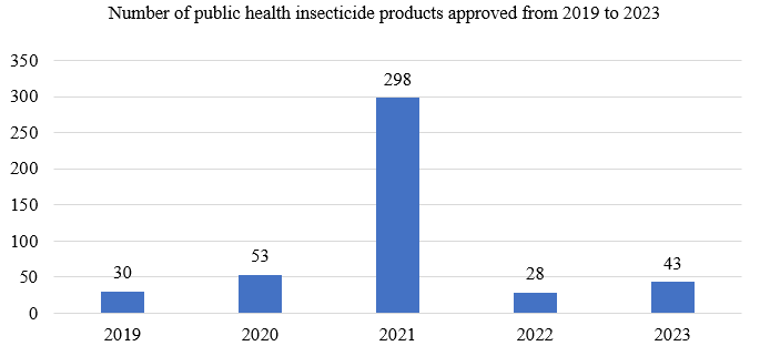 Following the implementation of the new Pesticide Regulations in 2017, the registration of public health insecticides has maintained an average annual count of approximately 50. However, it is worth noting that in 2021, there was a notable increase with nearly 300 products approved under the transitional period policy.