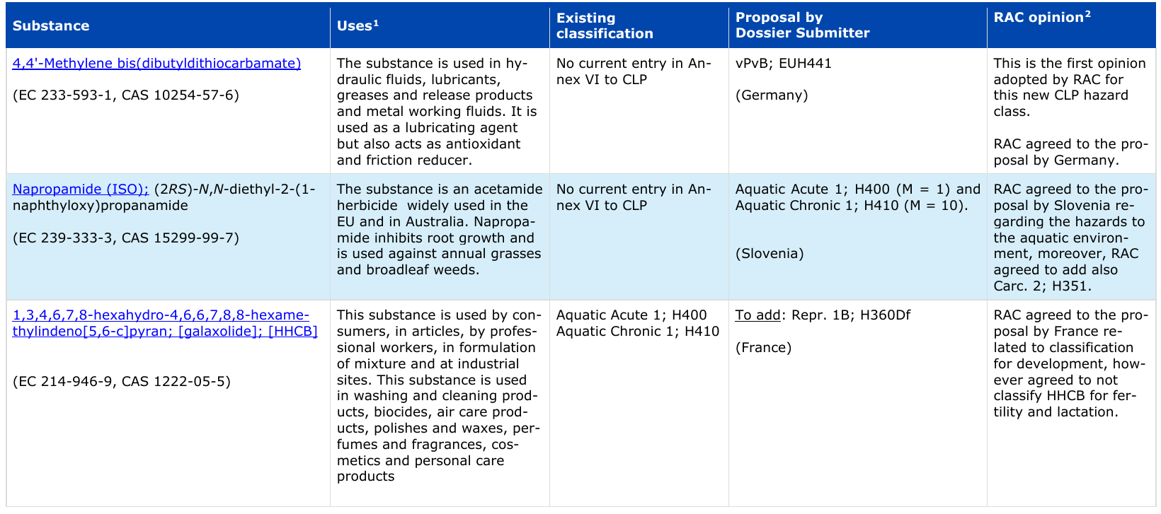 During the meeting, RAC adopted seven unified classification and labeling opinions, with the classification of 4,4'-methylenebis(dibutyldithiocarbamate) as vPvB standing out as a key highlight. This marks the first opinion issued by RAC for the new hazard category since the revision of the Classification, Labelling and Packaging (CLP) Regulation in 2023.