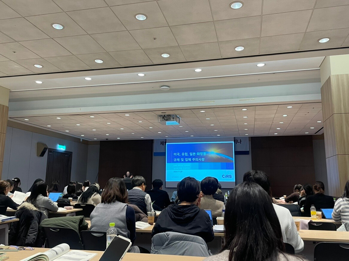 On November 28, 2024, the Global Cosmetics Market Trends Analysis Seminar, hosted by the Korea Cosmetics Industry Institute (KCII), was held at COEX in Samseong-dong, Seoul, South Korea. The seminar attracted numerous professionals from the cosmetics industry. Seong Su-ya, a consultant from the CIRS Korea cosmetics team, was invited as a guest speaker. She provided attendees with a detailed overview of the cosmetic regulatory developments and market entry strategies for major global markets.
