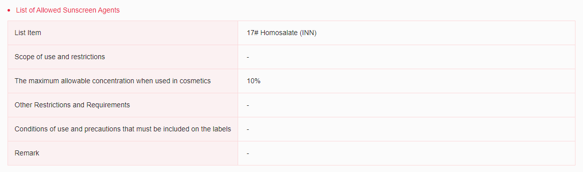 Homosalate has been included in the Inventory of Existing Cosmetic Ingredients in China (IECIC 2021) and the List of Allowed Sunscreen Agents with the maximum allowable concentration when used in cosmetics of 10%.