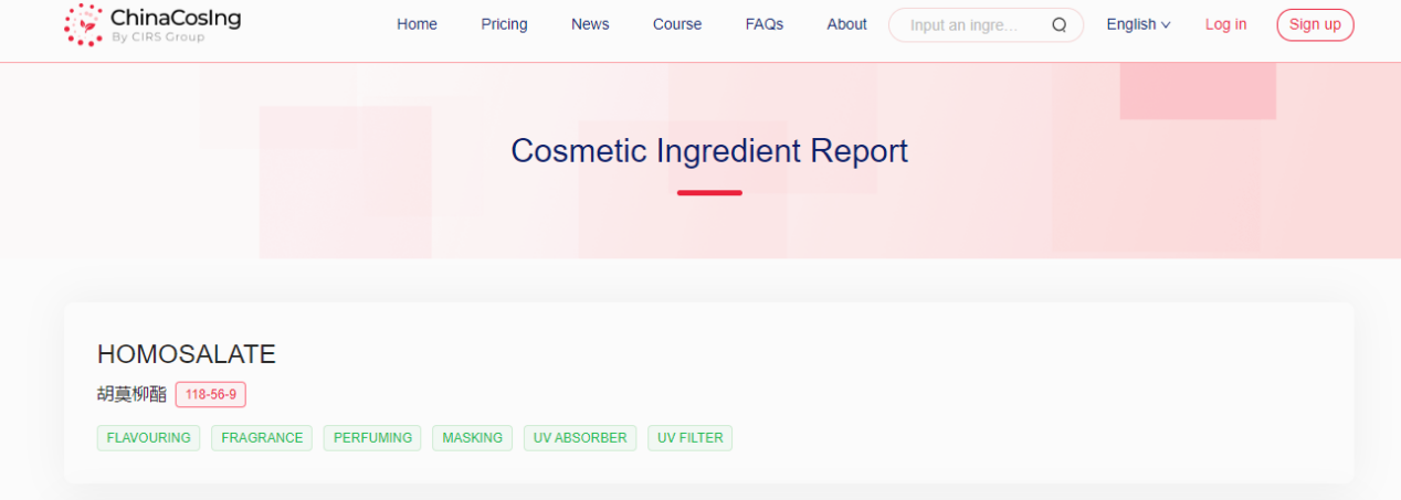 ChinaCosIng, indicates that Homosalate (CAS No. 118-56-9) can be used as flavoring, fragrance, perfuming, masking, UV absorber, or UV filter in cosmetics.