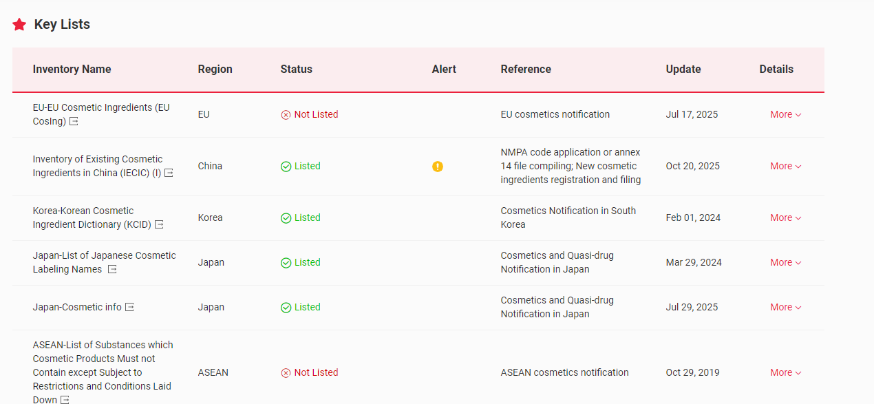 In China, it has been included in the Inventory of Existing Cosmetic Ingredients in China (IECIC) (I) and the Usage Information of Selected Ingredients Included in the International Authoritative Cosmetic Safety Assessment Data Index. More details could be found in the following figure.