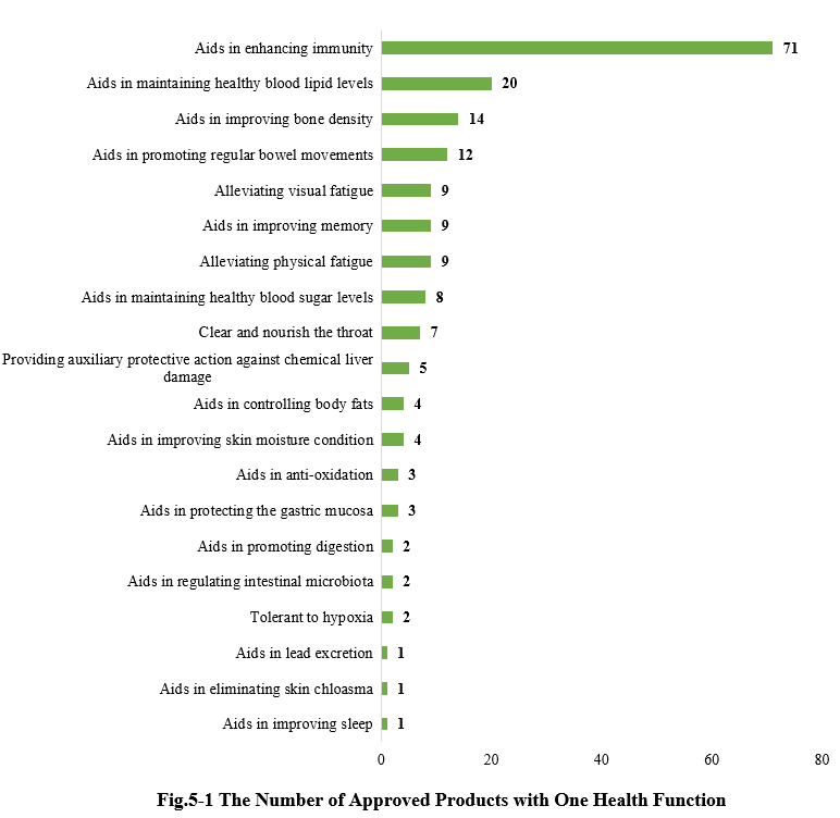 As shown in Fig.5-1, there are a total of 187 new products (including imported products) approved with a single health function. Among them, products with the health function of “Aids in enhancing immunity” received the largest number of approvals, with 71.