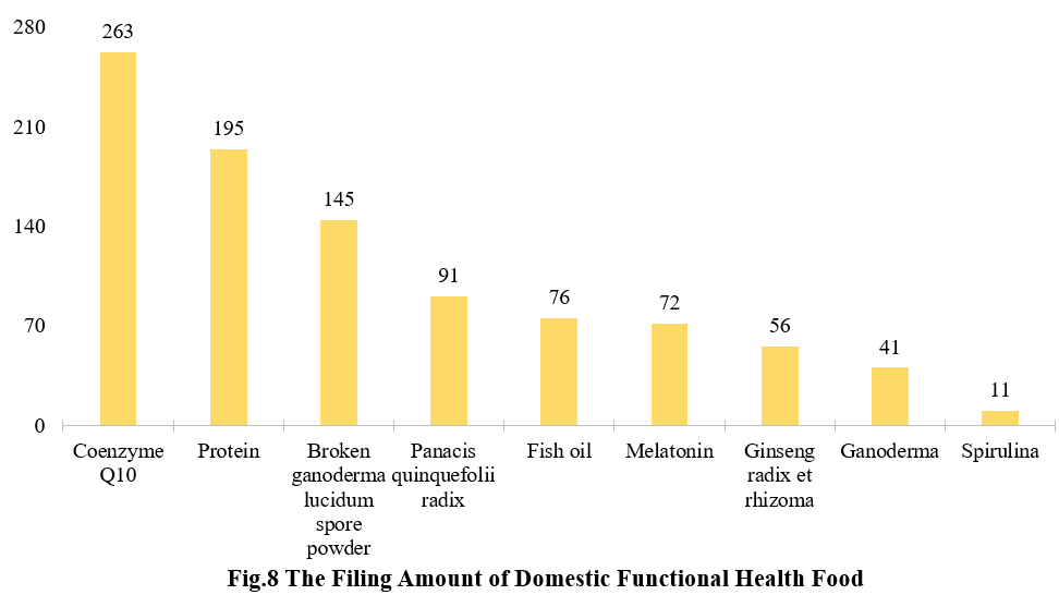 There are 263 filed products with coenzyme Q10 as raw materials have been added. Among the rest functional health foods, products with protein (soy protein isolate and/or whey protein), broken ganoderma lucidum spore powder rank second and third place with 195 and 145 respectively.