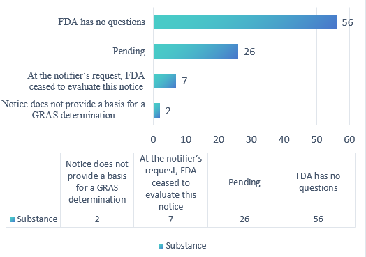 In 2025, a total of 56 substances received “FDA has no questions” letters, seven ceased to be evaluated, and two notices did not provide a basis for a GRAS determination. Additionally, 26 substances are still pending.